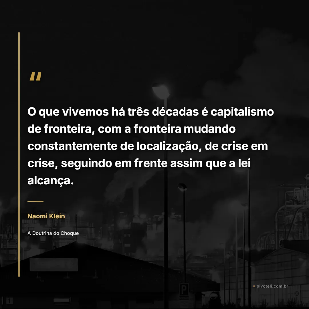 Naomi Klein sobre o intervalo entre o desastre e a regulação. A fronteira não é geográfica — é temporal. É o espaço entre o choque e a lei.