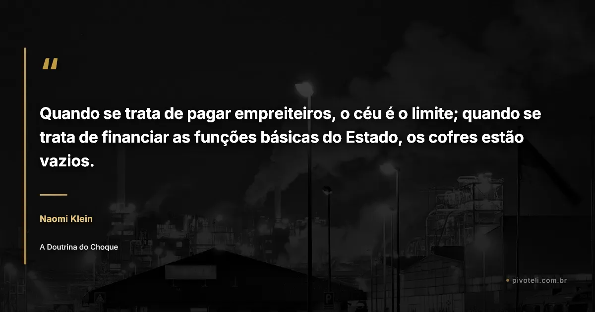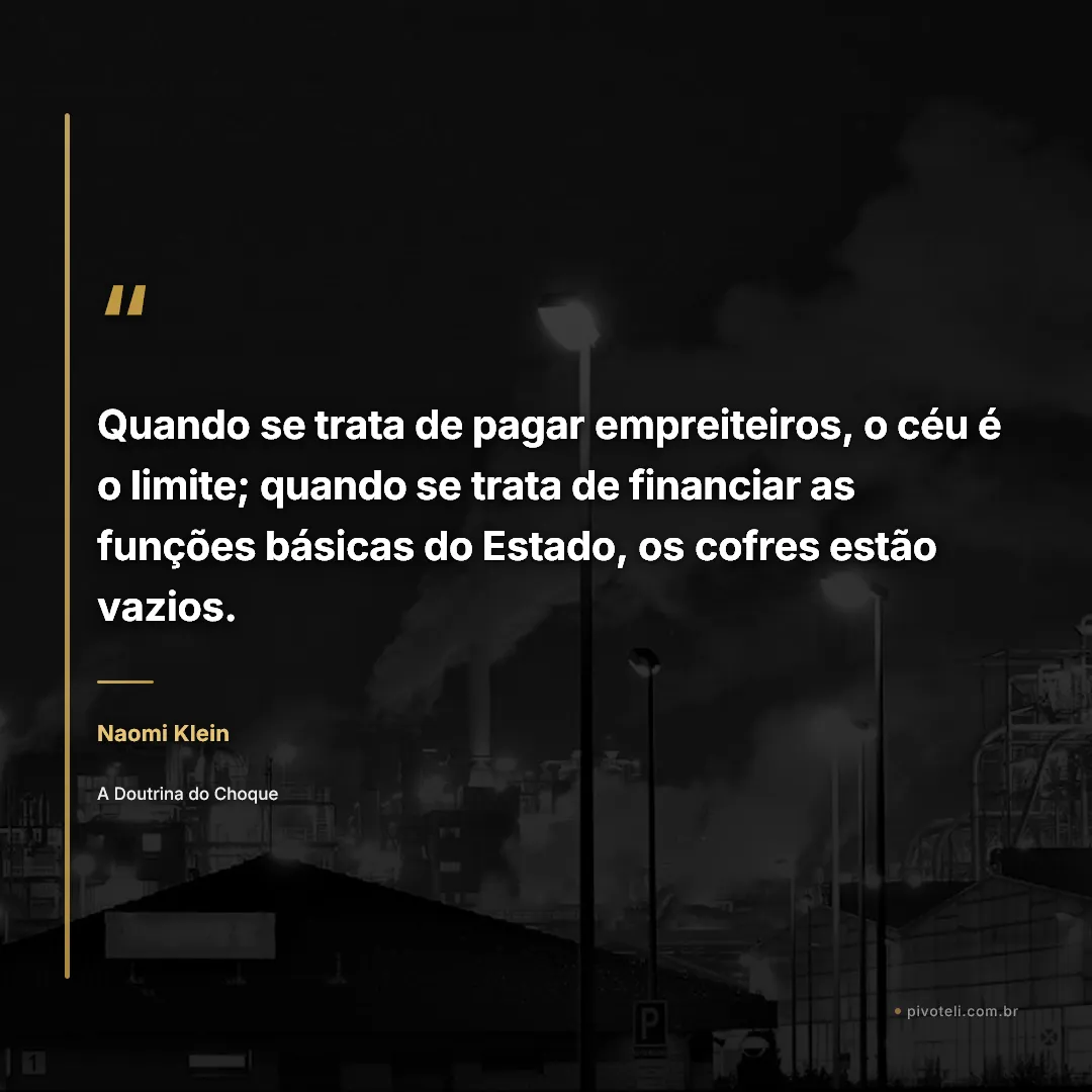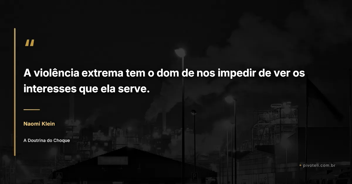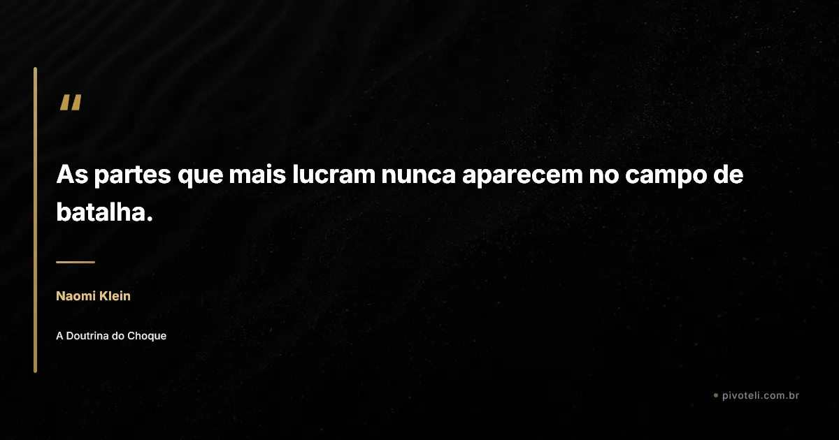 A frase mais compartilhada de A Doutrina do Choque. Enquanto todo mundo olha a fumaça, ninguém pergunta quem assinou os contratos.