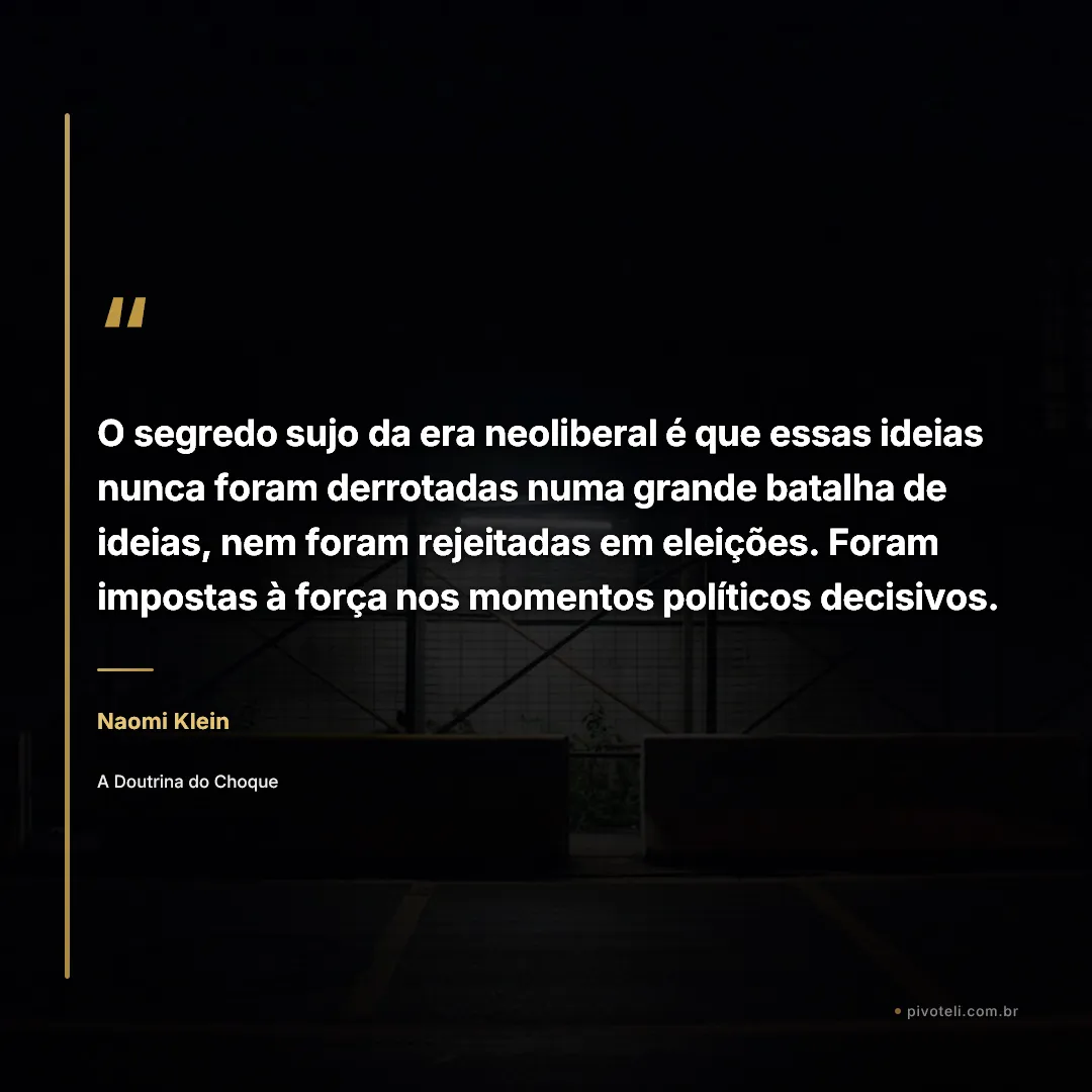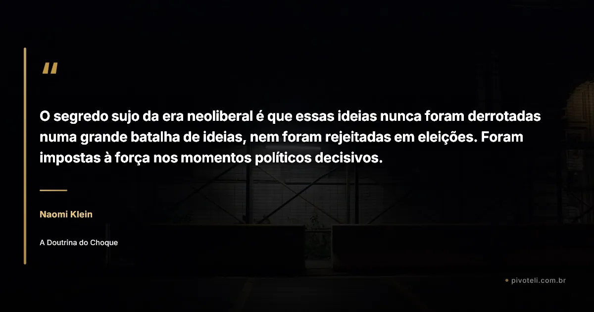 “O segredo sujo da era neoliberal é que essas ideias nunca foram derrotadas numa grande batalha de ideias, nem foram rejeitadas em eleições. Foram impostas à força nos momentos políticos decisivos.”