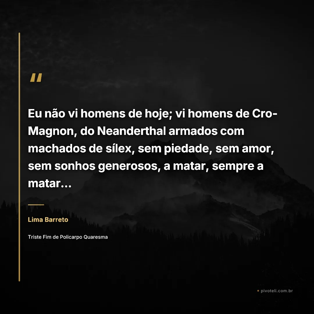 Por que importa: Lima Barreto não mostra a execução. Não precisa. O horror está no contraste entre os ideais de Quaresma e a brutalidade do sistema que o destrói. O Brasil mata seus sonhadores — não com argumentos, mas com balas.