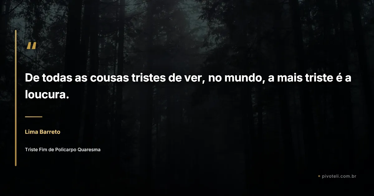 Por que importa: Lima Barreto conhecia hospícios por dentro — foi internado duas vezes. A passagem é autobiográfica e universal ao mesmo tempo. E levanta uma pergunta: quem é o louco? O homem que ama o Brasil demais, ou a sociedade que não tolera amor sincero?