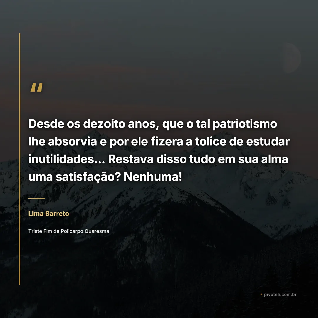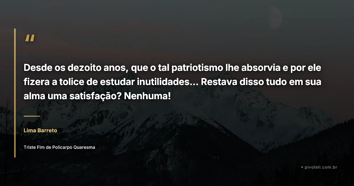 Desde os dezoito anos, que o tal patriotismo lhe absorvia e por ele fizera a tolice de estudar inutilidades... Restava disso tudo em sua alma uma satisfação? Nenhuma!