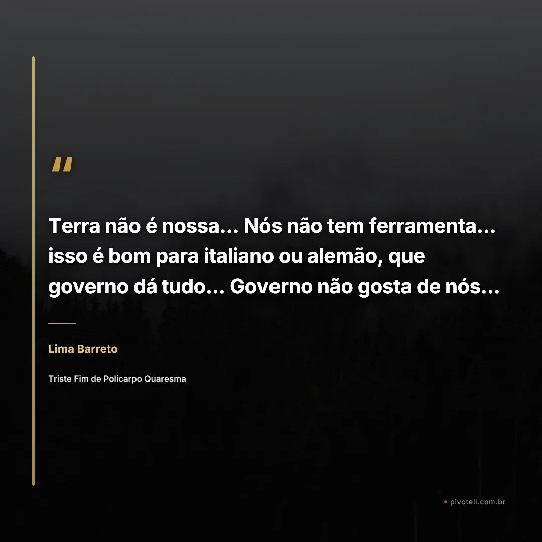 Por que importa: Os tratados que Quaresma leu prometiam um paraíso agrícola. A realidade é abandono, pobreza, descaso. Lima Barreto desmonta o mito da “terra abençoada” — o Brasil não é pobre por falta de recursos, mas por falta de política séria. Os livros mentem; a terra cobra.